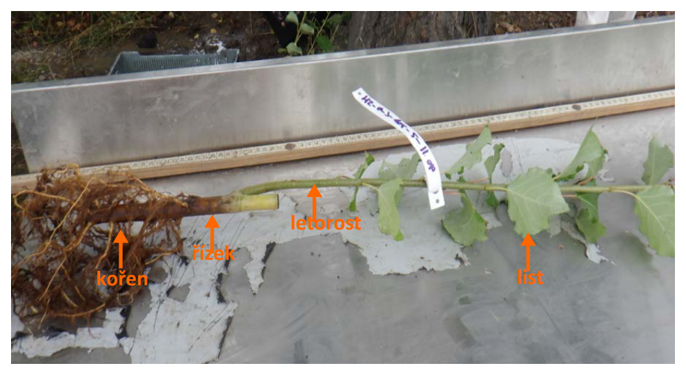 Obrázek 1:  Roční rostlina topolu vypěstovaná z řízku v toxickém půdním substrátu a její segmenty, pro které byly zjišťovány hodnoty BAS